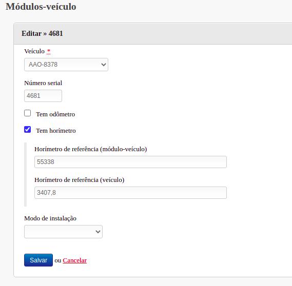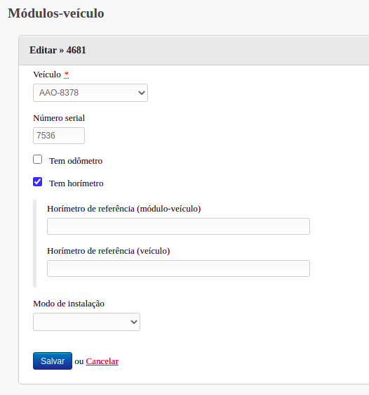Será necessário alterar o número serial colocando o número do novo módulo-veículo instalado e os campos de referência devem ser limpos, abaixo segue o exemplo de como deve ficar o formulário após a troca do módulo-veículo: