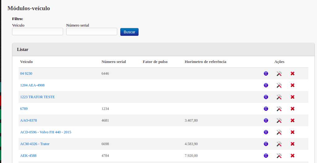 Quando for realizada alguma alteração física no módulo (retirada ou troca), deve ser atualizado o cadastro no sistema; para isso deve-se clicar no item Módulo-veículo - Listar e será exibida a seguinte tela: