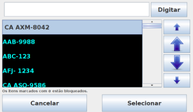 Para selecionar o veículo que irá abastecer, o operador deve selecionar o campo Veículo (o campo fica com a cor de fundo preta) e clicar no botão Entra no teclado, logo depois será exibida a tela de seleção de veículos.