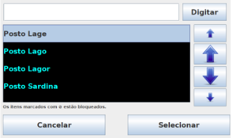 Para escolher o posto que será abastecido deve-se selecionar o campo Posto (quando selecionado ficará com a cor de fundo preta), em seguida deve-se pressionar o botão Entra do teclado. Será exibida uma lista com os postos cadastrados. Deve-se selecionar o posto desejado com as teclas de navegação do teclado (Anterior ou Próximo), em seguida pressionar o botão Entra para que o posto seja escolhido e o botão Selecionar fique destacado na cor preta. Para confirmar, o operador deve pressionar o botão Entra do teclado novamente.