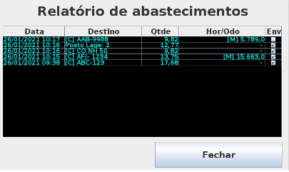 Para acessar o relatório, deve-se selecionar a categoria 1 Saídas de combustível e a função 0 Relatório. Será exibido um relatório contendo os últimos abastecimentos realizados.