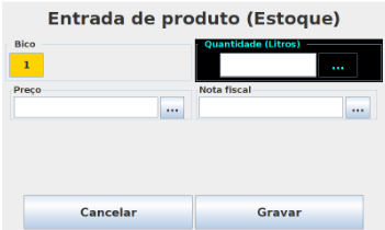 Caso o posto possua mais de um tanque de abastecimento, o operador deve selecionar o bico que está ligado ao tanque que receberá combustível e no campo Quantidade (Litros) colocar a devida quantidade descarregada no tanque, Preço colocar o preço unitário do litro, Nota fiscal colocar o número da nota fiscal, e em seguida pressionar o botão Entra do teclado para que o botão Gravar fique selecionado (sua cor de fundo ficará preta), para confirmar deve-se pressionar o botão Entra do teclado.