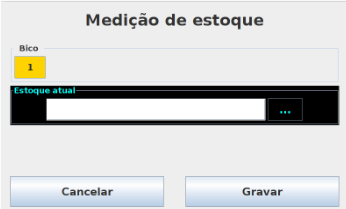 Caso o posto possua mais de um tanque de abastecimento, o operador deve selecionar o bico que está ligado ao tanque que será realizada a medição de estoque e no campo Estoque atual coloca-se a quantidade de combustível que possui no tanque, em seguida pressionar o botão Entra do teclado para que o botão Gravar fique selecionado (sua cor de fundo ficará preta), para confirmar deve-se pressionar o botão Entra do teclado.