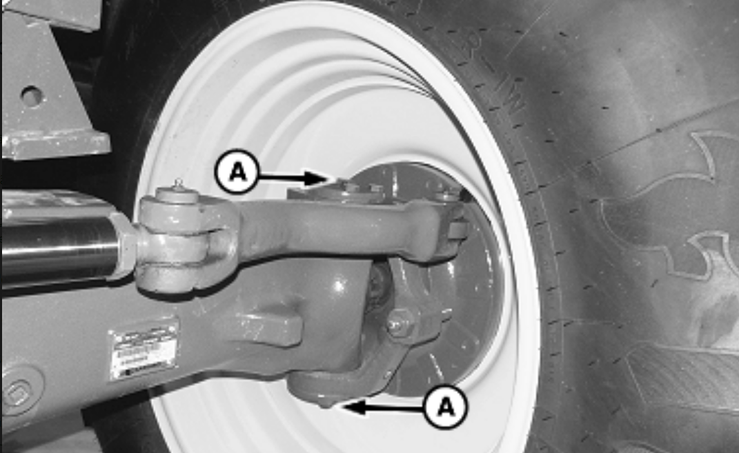 1 - Lubrifique os rolamentos superior e inferior dos pinos mestre (A) em cada lado do eixo traseiro.
