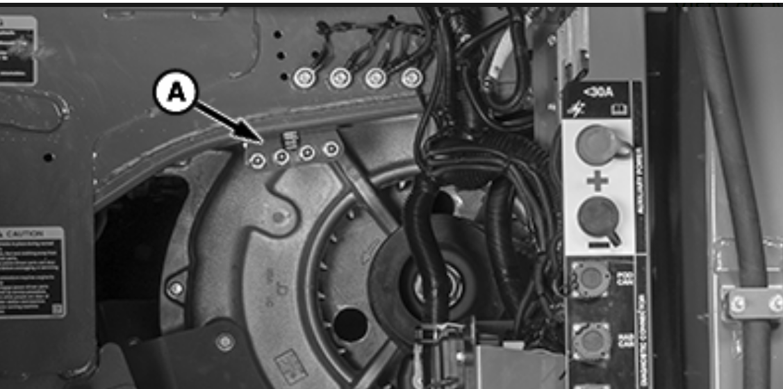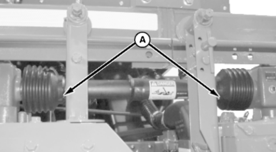 3 - Nas máquinas em que as tampas plásticas nos eixos transversais de acionamento da unidade estão acorrentadas às unidades, lubrifique as duas graxeiras (A) em cada tampa.