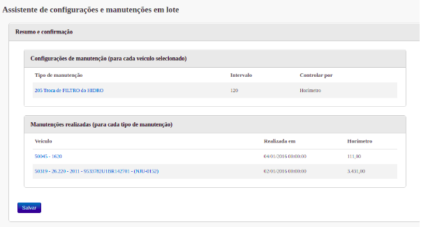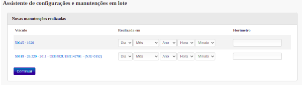 Por fim, preencher a data e o valor de horímetro ou odômetro da última manutenção para cada veículo, na próxima tela irá aparecer um resumo sobre as configurações e as manutenções que estão sendo criadas, para conferência.