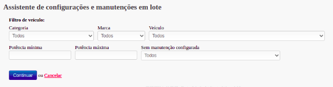 Na sequência escolher qual o tipo de manutenção; se o veículo é controlado por odômetro ou horímetro, delimitar o intervalo que deve ser realizada a manutenção e selecionar os veículos.
