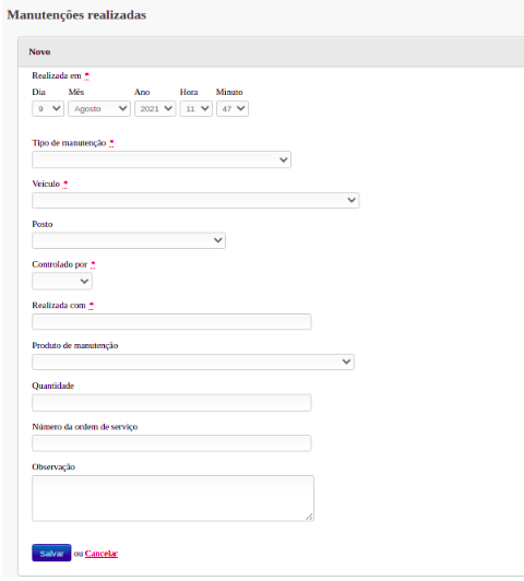 No item Registrar Manutenção, pode-se registrar uma nova manutenção realizada.
