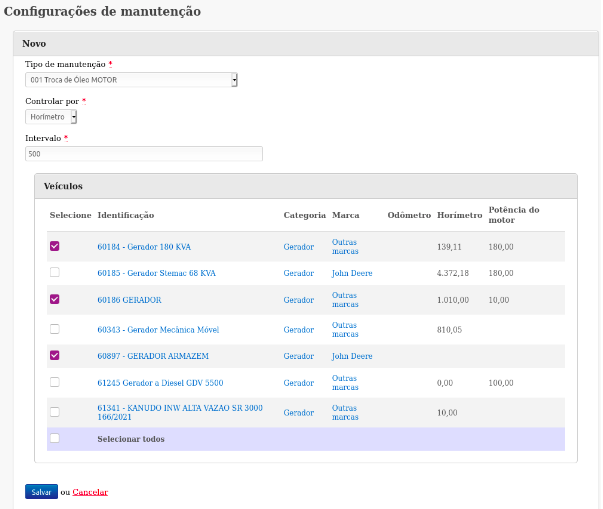 Na sequência, escolher qual o tipo de manutenção; se o veículo é controlado por odômetro ou horímetro, delimitar o intervalo que deve ser realizada a manutenção e selecionar os veículos. Exemplo: Troca de Óleo - Horímetro - 500 horas