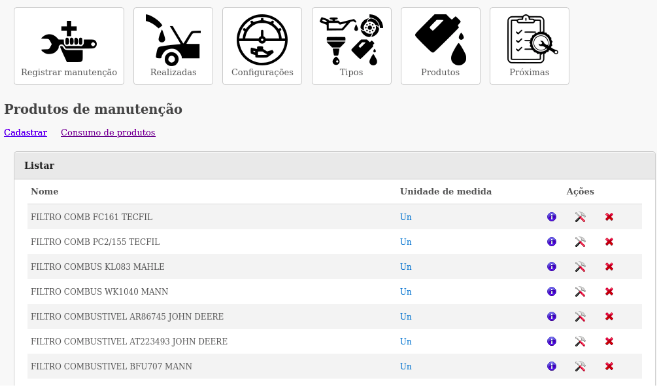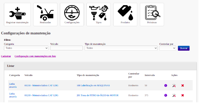 Este módulo é o software responsável pela gestão das manutenções. Nele são cadastrados todos os veículos para acompanhamento, horímetros e odômetros de manutenção, tipos de manutenção, produtos utilizados, a periodicidade de uma manutenção e a manutenção realizada.