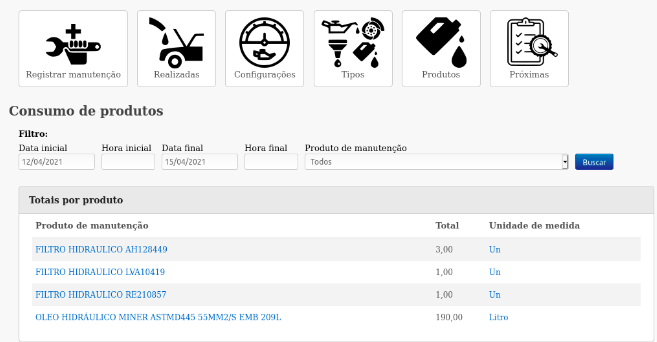 Nesta tela existe também o relatório de Consumo de produtos, ao clicar e selecionar um período é possível acompanhar o consumo dos produtos utilizados nas manutenções.