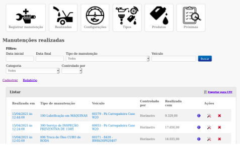 No item Realizadas, pode-se verificar as manutenções realizadas. Ao clicar no item será exibida uma tela listando todas as manutenções registradas.