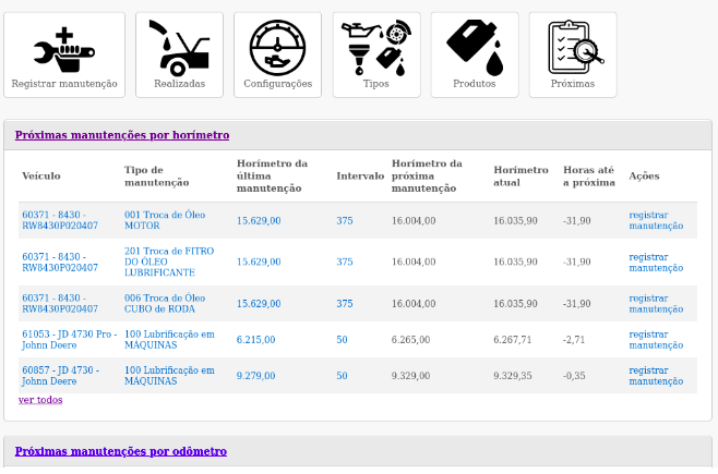 No quadro de próximas manutenções por horímetro/odômetro pode ser registrada diretamente a manutenção pendente clicando em Registrar manutenção.