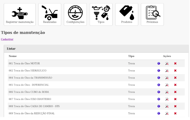 No item Tipos de manutenção, pode-se visualizar quais os tipos de manutenção cadastrados e também pode-se cadastrar um novo ao clicar em Cadastrar.